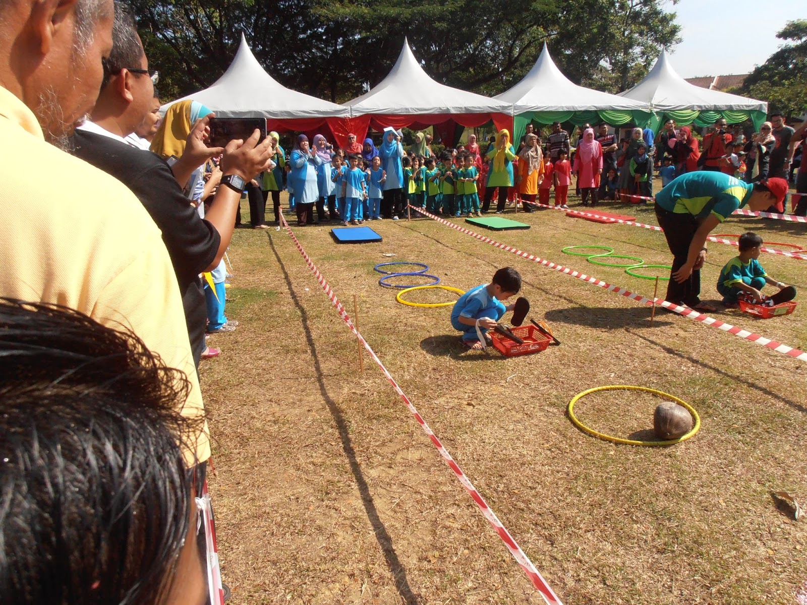 Ni salah satu acara untuk kanak-kanak 6 tahun presint 9..mula-mula kena merangkak macam askar pastu lompat satu kaki, susun selipar dan akhir sekali baling botol dengan kelapa. kalau nak tengok video boleh tengok kat FB saya(KLIK).